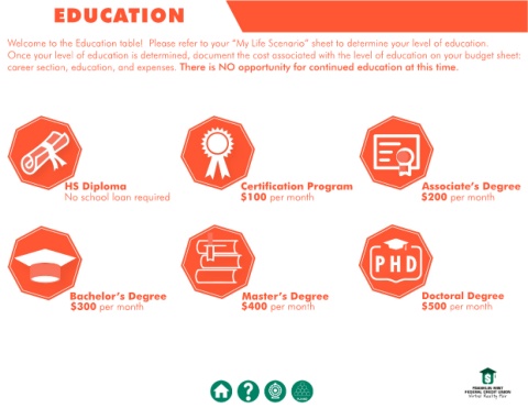Welcome to the Education table! Please refer to your “My Life Scenario” sheet to determine your level of education.